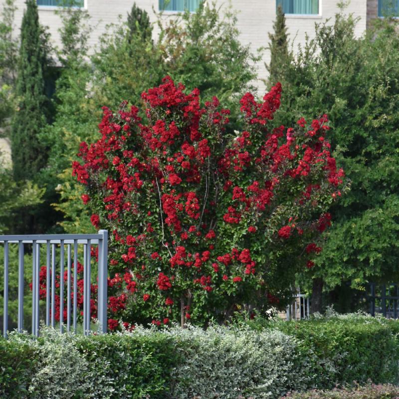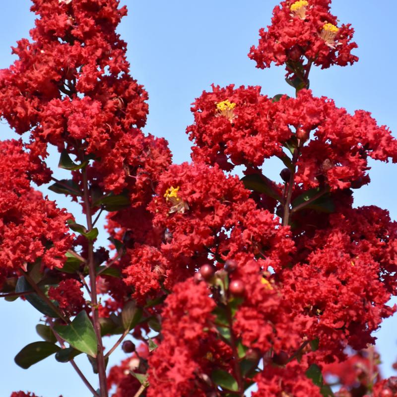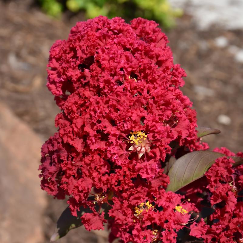 This outstanding variety produces volumes of vivid, cherry-red frilly blooms in summer, over contrasting deep purple foliage; blooms continuously on the same panicle; captivating focal point for the garden or border; also good for container planting