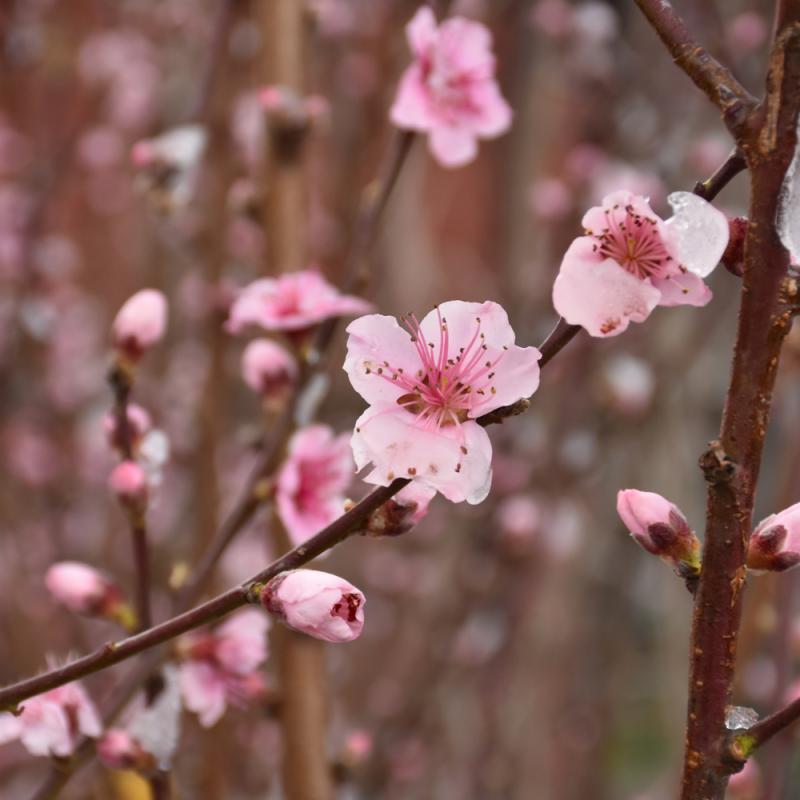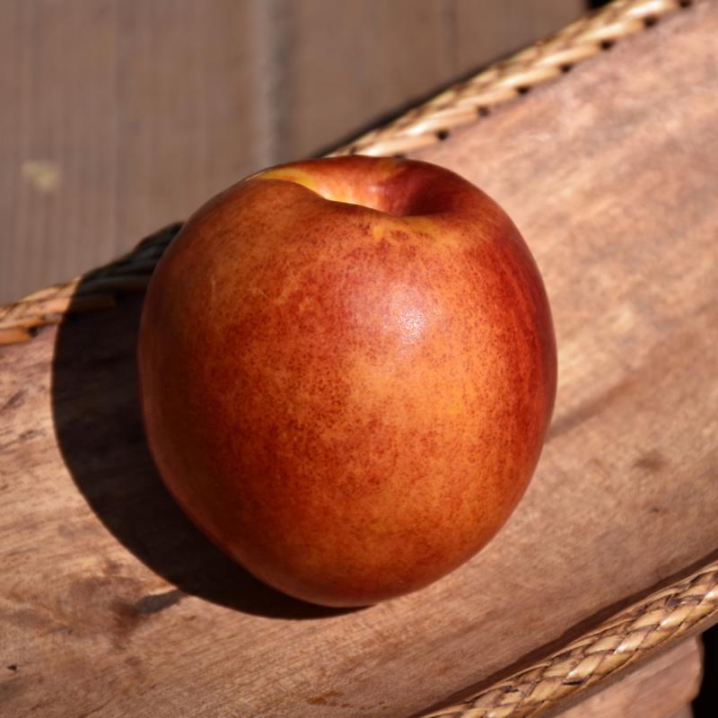 A compact tree producing medium to large freestone nectarines; highly ornamental, with pale pink flowers in spring and a low, spreading habit; susceptible to late spring freezes and disease, needs full sun and well-drained soil
