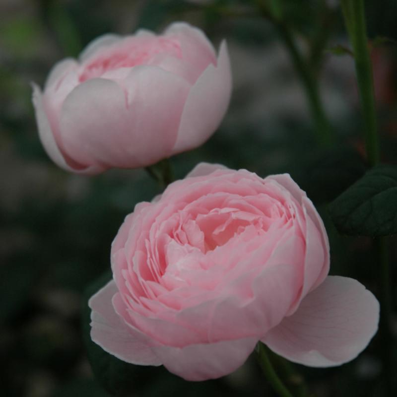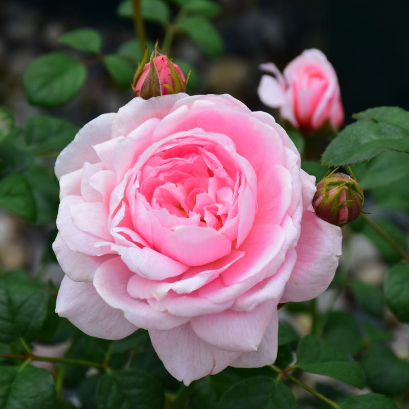 One of the most beautiful English roses, this variety produces full cup shaped blooms of soft pink; needs full sun and well-drained soil; good disease resistance; a robust and free flowering rose
