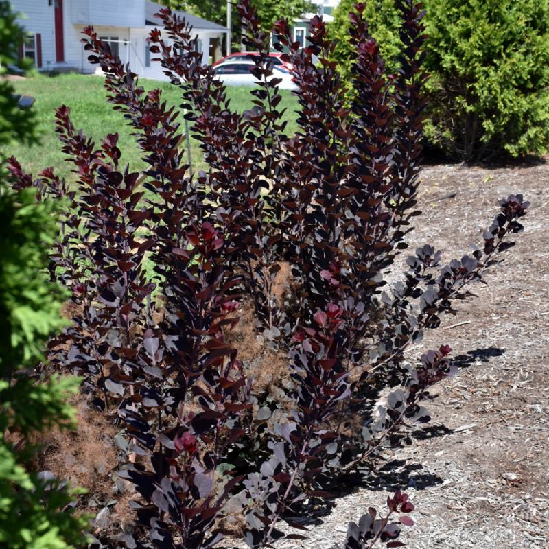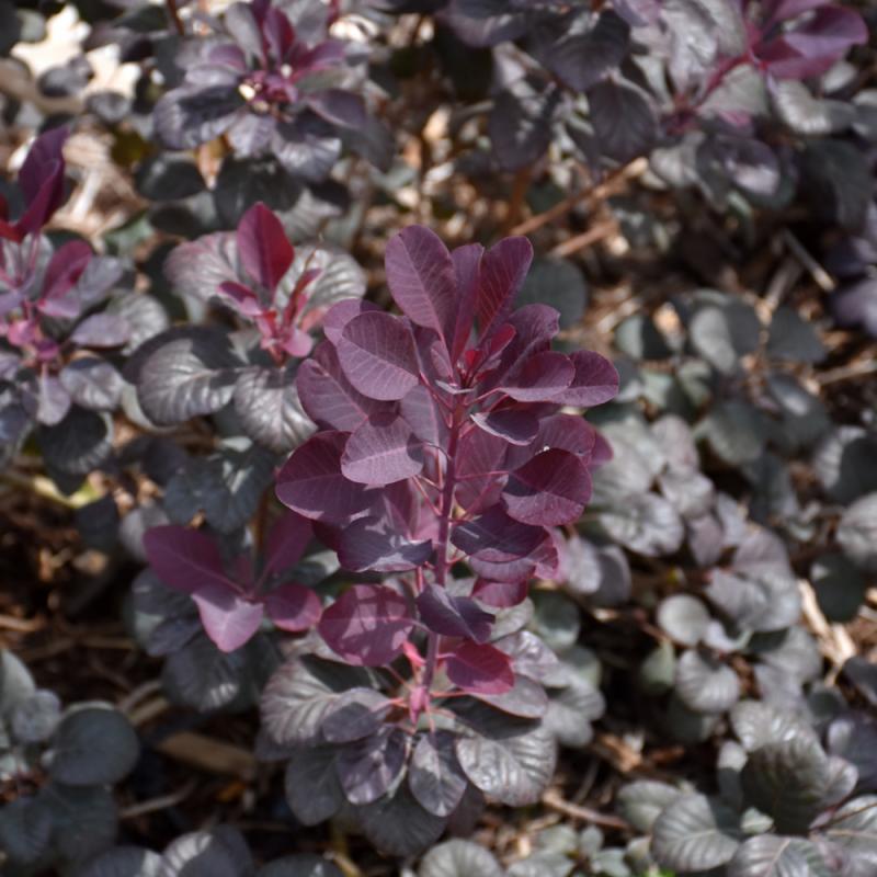 Foliage on this outstanding dwarf variety emerges rich purple, progresses to deep near-black as summer heat comes on, then lightens up in shades of red and orange in fall; large, soft panicles of bloom in early summer has the appearance of smoke