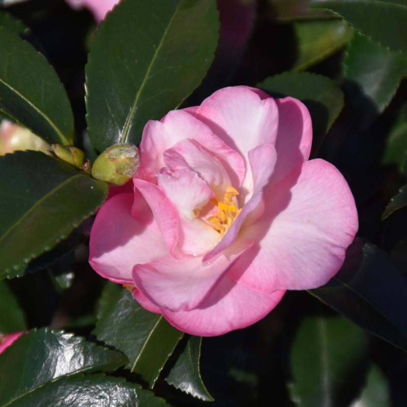 Masses of lovely, large, semi-double white to blush flowers with orchid pink highlights; lustrous, evergreen leaves and vigorous, upright habit; provide rich, acidic, moist, well-drained soil