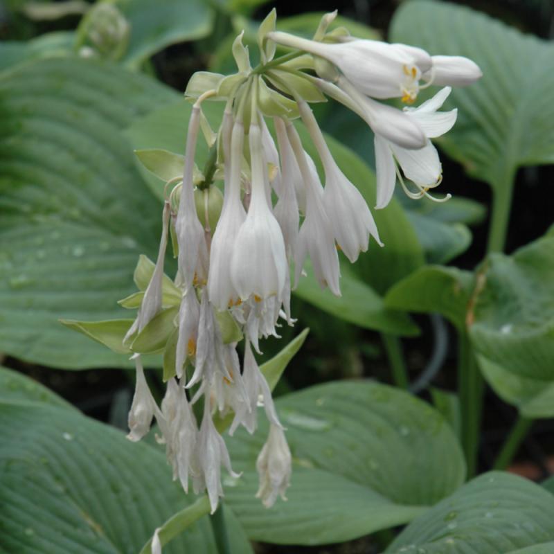 A gargantuan hosta with gigantic green leaves that are 18" long by 14" wide; they are matt finished and slightly wavy; very impressive in a large space in the garden; tall spikes of near white flowers in early summer