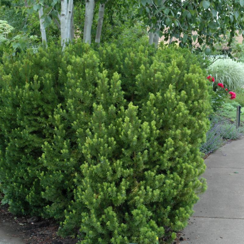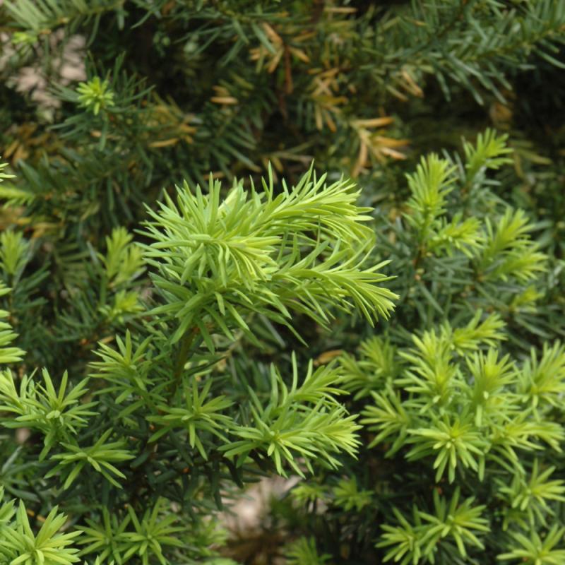 A top notch landscape shrub featuring a dense, upright habit and bright green emerging foliage held over dark evergreen needles in spring; becomes quite large, makes a great hedge, takes pruning very well; one of the few evergreens that loves shade