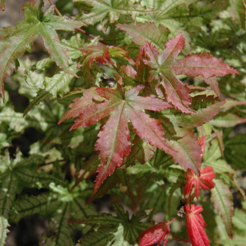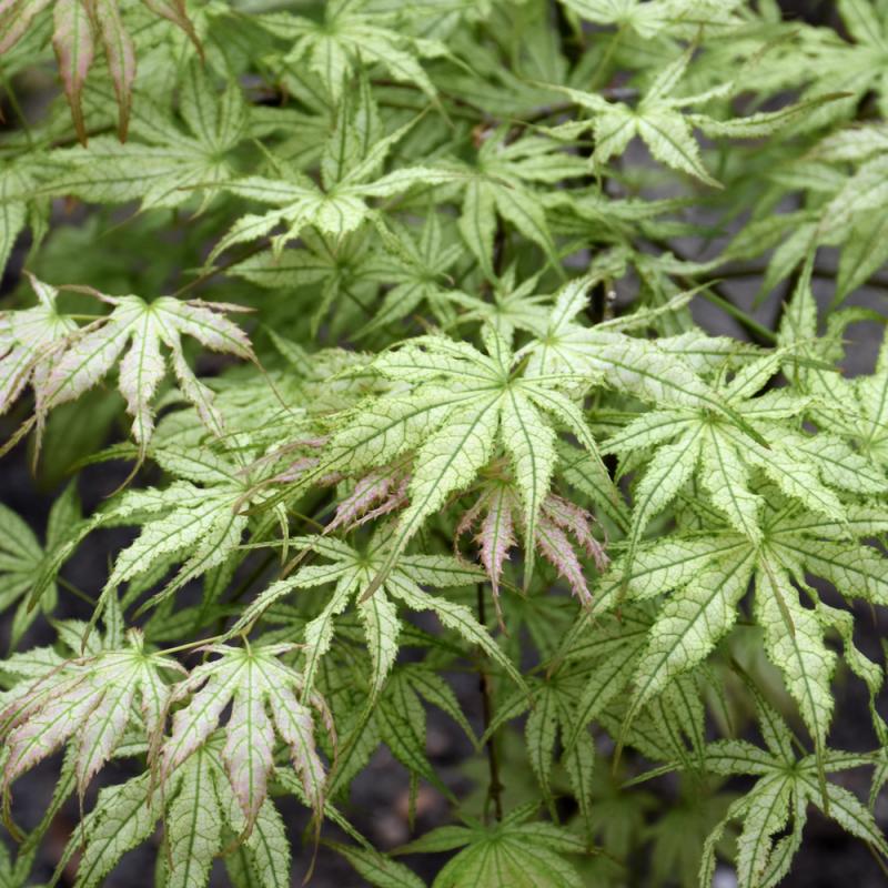 Creamy leaves have green veins and rose undertones from spring through summer, turning bright yellow in fall; a shrubby form with an elegant vase shape habit, often grows wider than tall