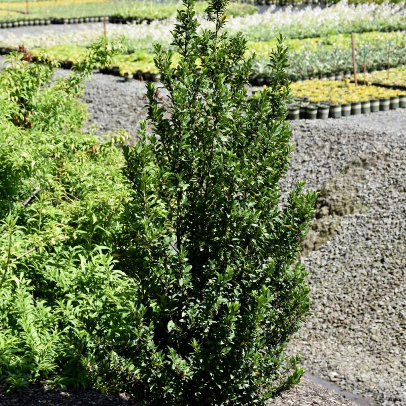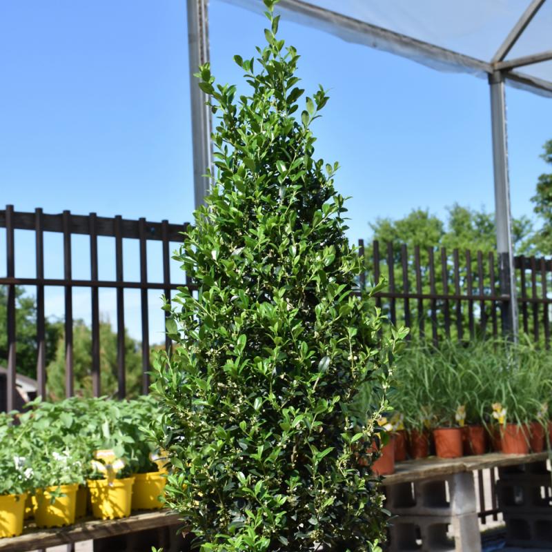 A handsome and versatile male evergreen holly with a pyramidal habit; dense, glossy foliage is tolerant of shearing and great for topiary or formal accent; creates a perfect screen, hedge or windbreak; small cream colored flowers do not produce berries