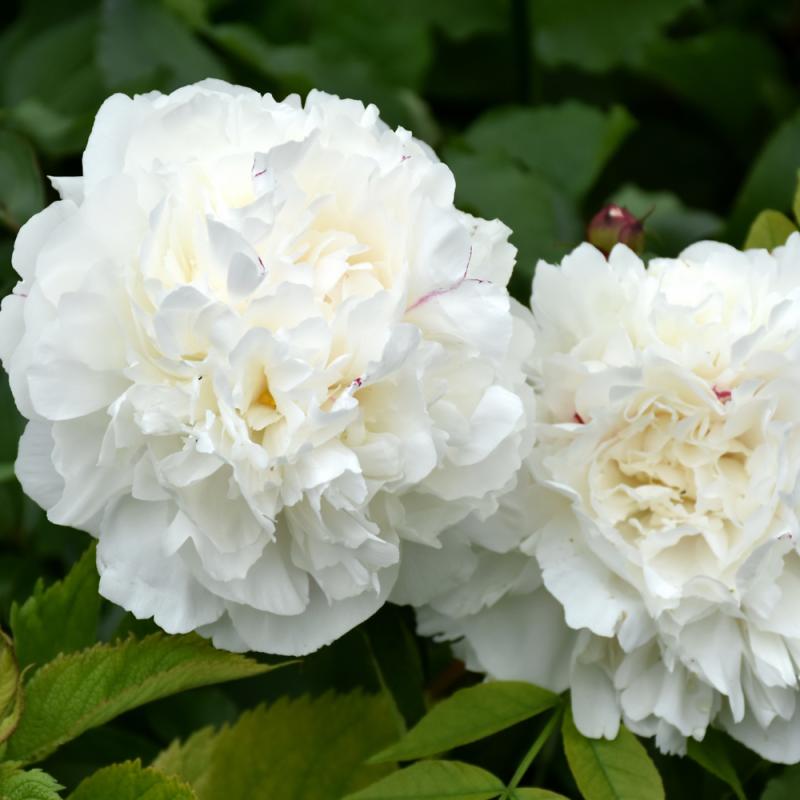 Duchesse de Nemours Peony features bold fragrant double creamy white flowers with gold centers at the ends of the stems from late spring to early summer. The flowers are excellent for cutting. Its compound leaves remain green in color throughout the season.