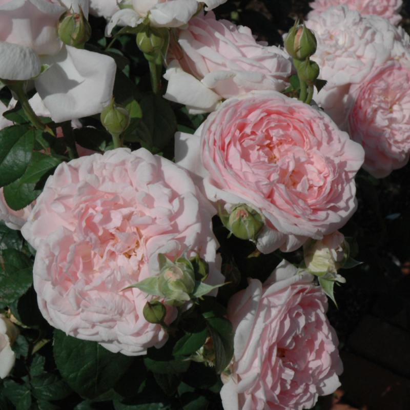 One of the most beautiful English roses, this variety produces full or double blooms of soft pink with salmon tones; needs full sun and well-drained soil; good disease resistance; a robust and free flowering rose