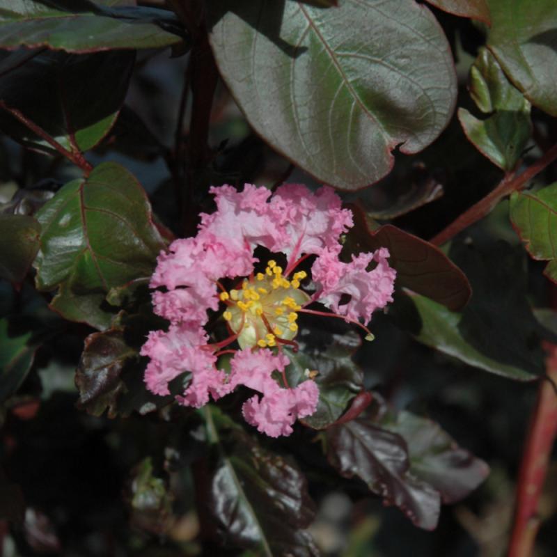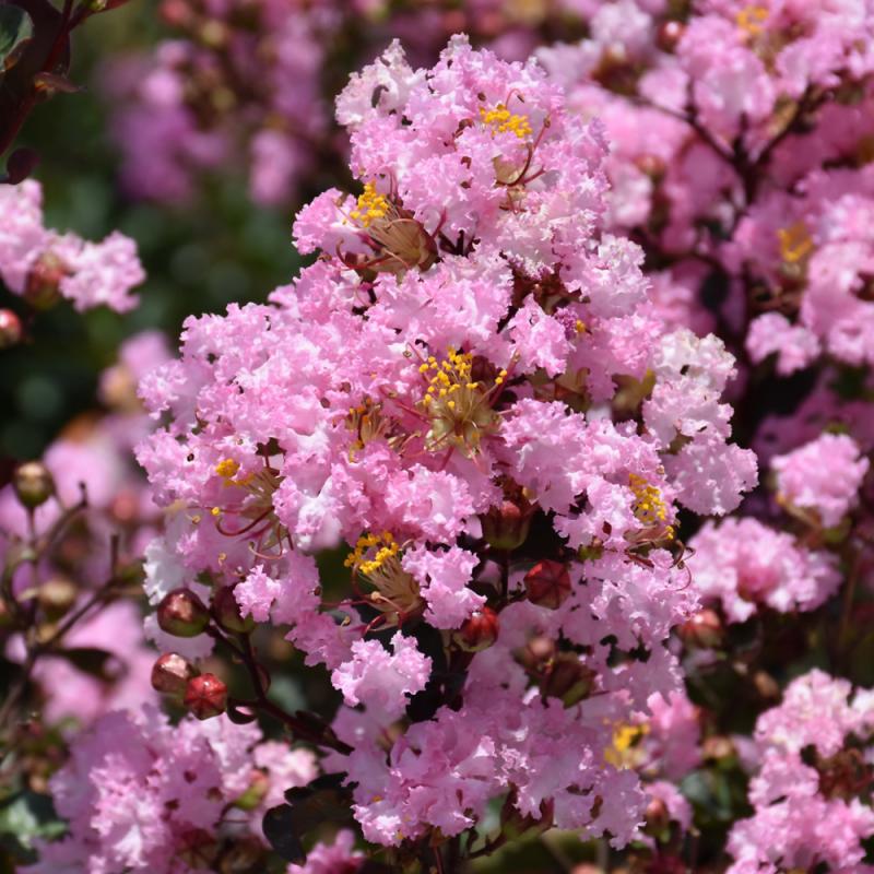 This beautiful and delicate looking crapemyrtle produces volumes of frilly pink blooms contrasting near purple foliage; a captivating focal point for the garden or border; can be grown as a small, multistemmed tree