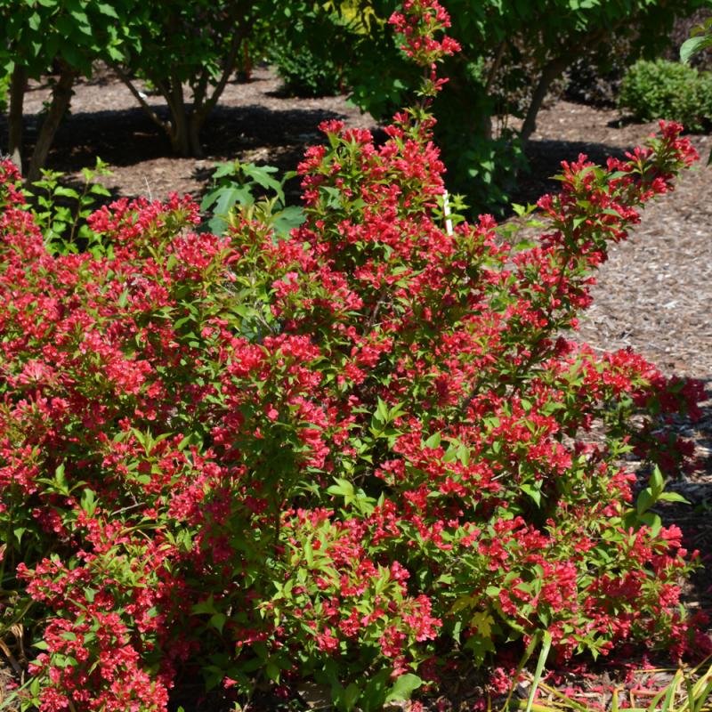 This is a magnificent cultivar that forms a stately mounded shrub with rich green glossy foliage; regal red trumpet-shaped flowers rebloom all season and attract hummingbirds; very, very showy, ideal for the mixed garden border