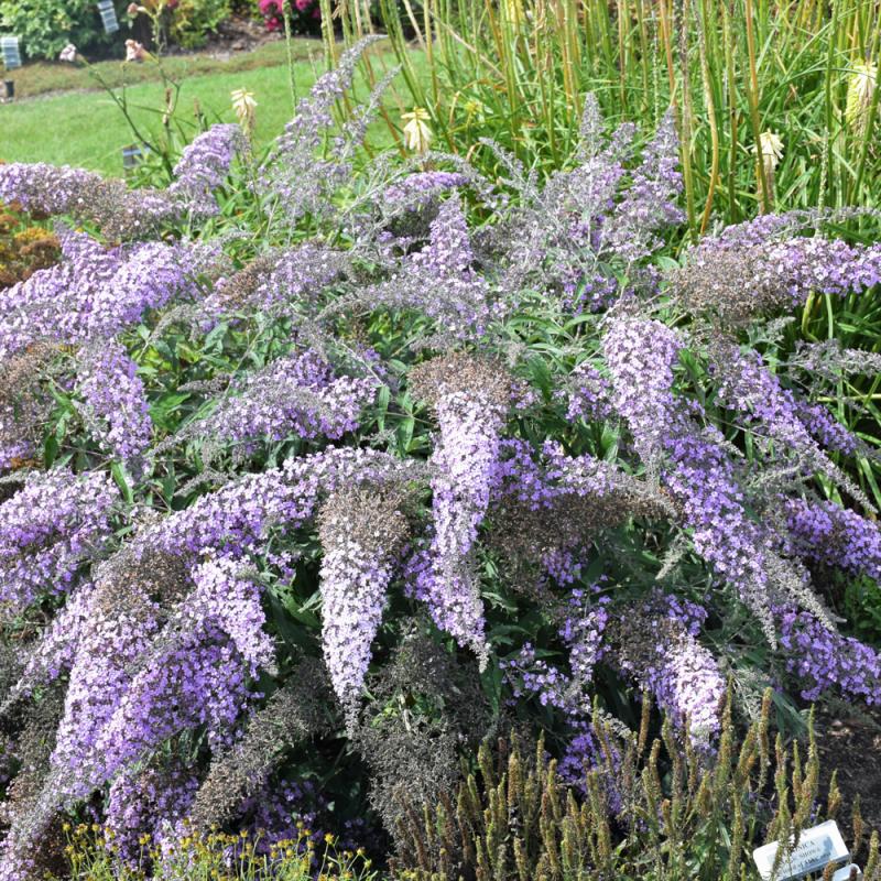 A compact garden plant with huge, arching light lavender and purple flower spikes in summer that bloom profusely; attracts butterflies; may treat as a perennial and cut it back to the ground each spring as it regrows vigorously and blooms on new wood
