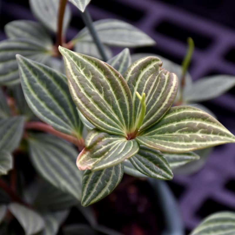 This vibrant selection produces small, oval, dark green leaves with parallel, stripe-like veins; grown primarily for foliage, flower spikes are not significant; medium to bright light, no direct sun
