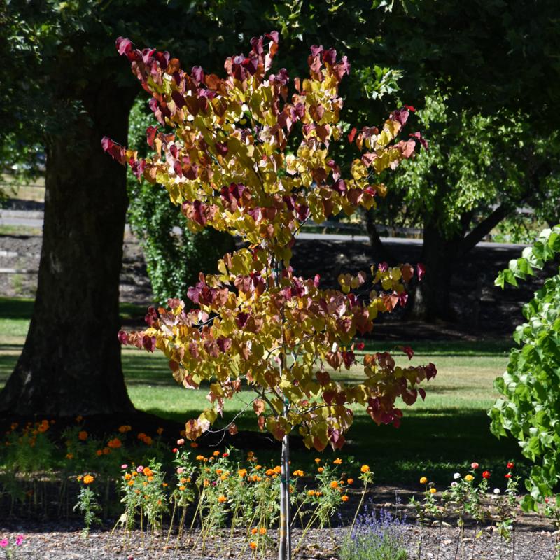 | A spectacular small ornamental tree featuring perfectly pink flowers in early spring, followed by stunning burgundy-red new leaves that mature to bright yellow and green; color display is persistent throughout the season; a great landscape accent |