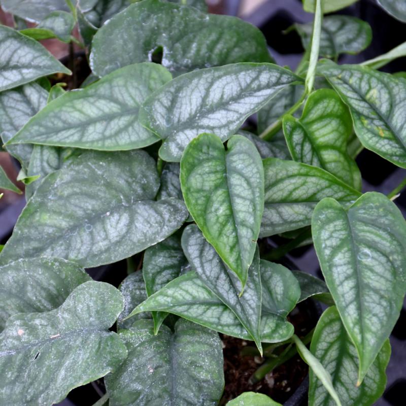 This compact variety presents stunning, glossy leaves with bright silver patches and deep green veins; adult leaves are less silver and form holes; can be allowed to cascade or trail, or be trained on a trellis or moss pole; a stunning indoor plant