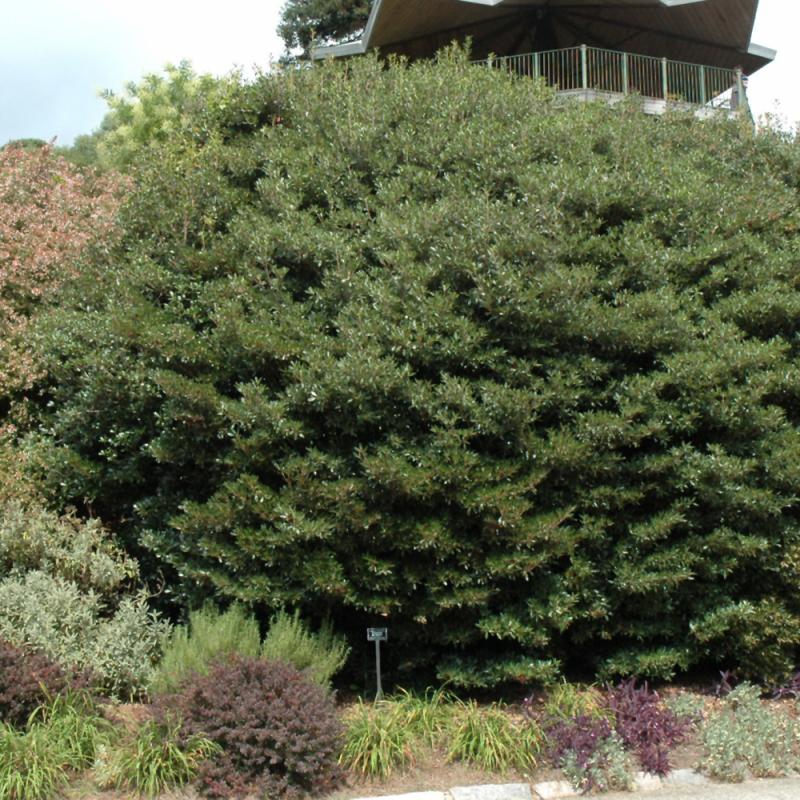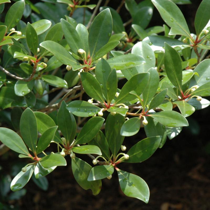 This plant is noted for its striking foliage which is dark green and glossy; perfect along a border, trained up a wall, or in a container; likely to need pruning; susceptible to and should be protected from spider mites