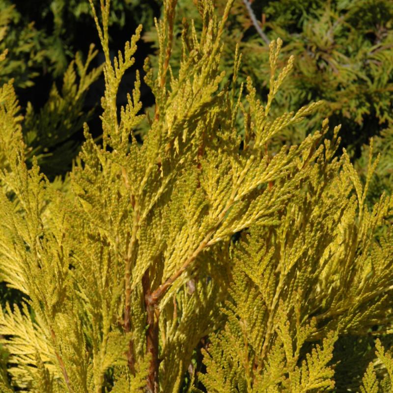 A stunning accent tree which features rich golden sprays of foliage generously flecked with yellow and a narrow upright pyramidal habit; an excellent choice for color accent or articulation, performs best in moist, humid locations, but is adaptable