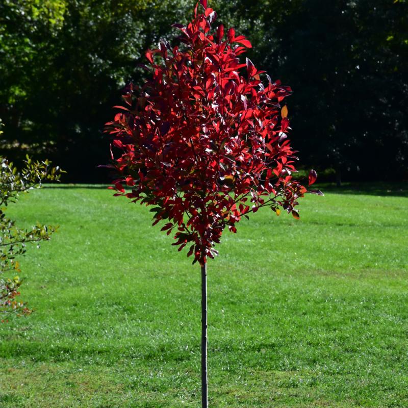 A glorious native variety producing bold red new foliage that matures to a glossy dark green, then fiery scarlet in fall; consistent pyramidal habit with strong branching; needs moist, organic, acidic soils, intolerant of urban pollution