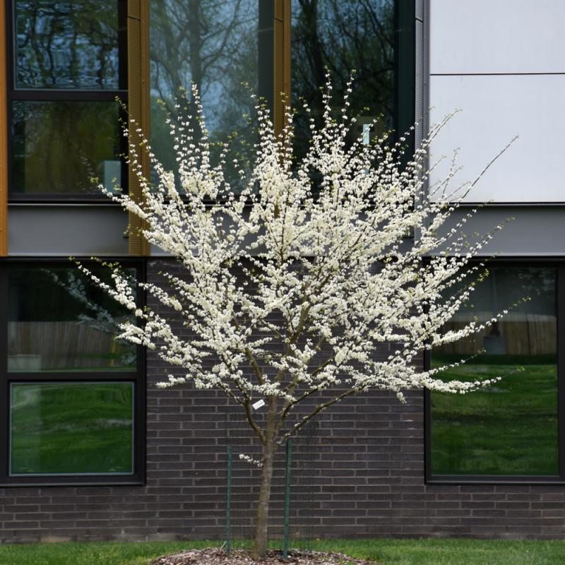 A spectacular spring bloomer, with abundant and very showy white flowers, held tightly on bare branches in early spring; rivals any small ornamental tree for specimen use in the home landscape