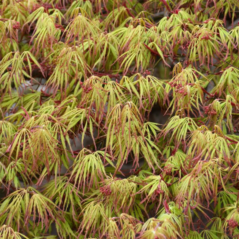 A compact, mounded and weeping dwarf variety with graceful light green foliage edged in red; beautiful hues of orange in the fall; excellent as a small garden accent