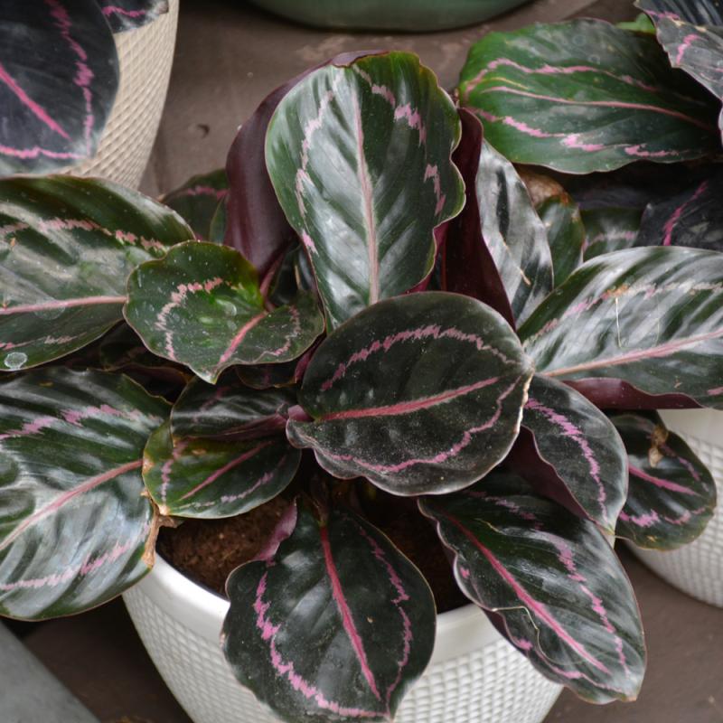 A striking houseplant featuring rounded, near black leaves with dazzling, bright pink markings; thrives in low to medium light; provide consistent moisture and humidity; should not be watered or misted with tap water, distilled or filtered is best