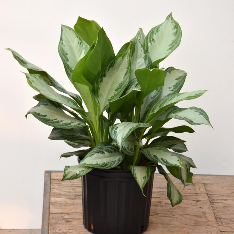 A very popular container plant that is very easy to grow; survives poor lighting and low ventilation; large, showy variegated green leaves with silver centers; depending on pot size it can range from being used for tabletop or as a floor accent