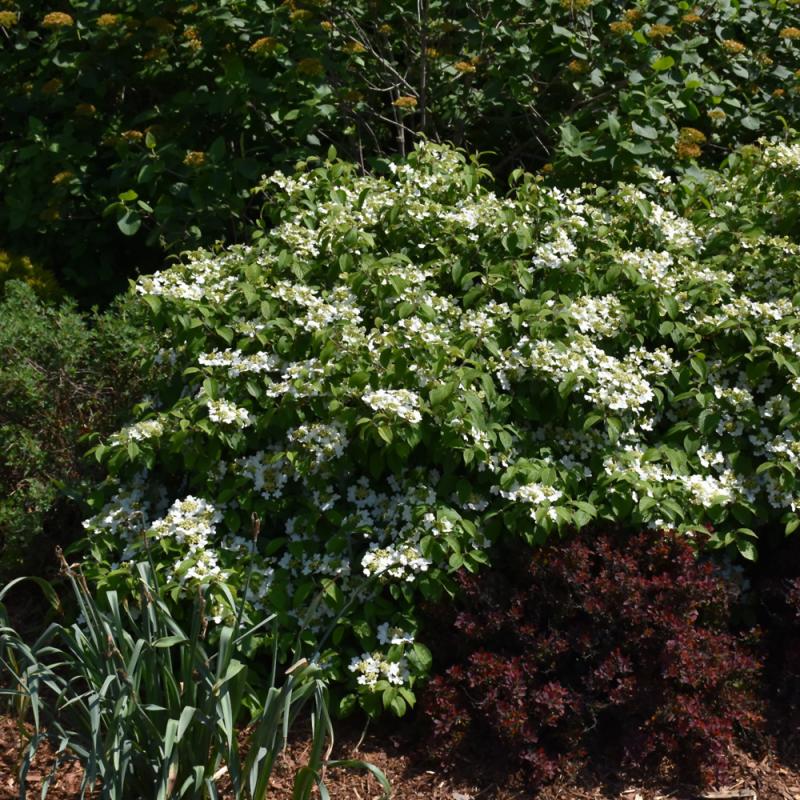 One of the highest quality garden shrubs available, with showy lacecap white flowers in spring; a dwarf, compact selection with an attractive horizontal branching habit and good fall color; a great landscape specimen, or massed along borders