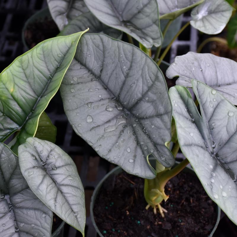 This small variety produces stunning, silver-gray heart shaped leaves with contrasting black veins and reddish-purple undersides; this striking tropical makes a great houseplant; prefers bright, filtered sunlight