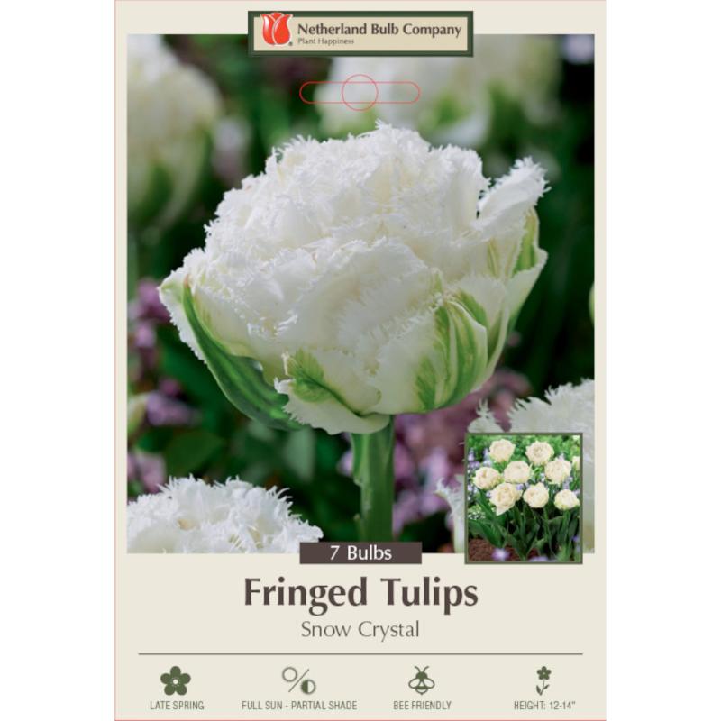 A double fringed tulip with pure white, heavily fringed petals that resemble a peony in full bloom. Its outer petals feature a subtle green stripe, adding to its elegance.