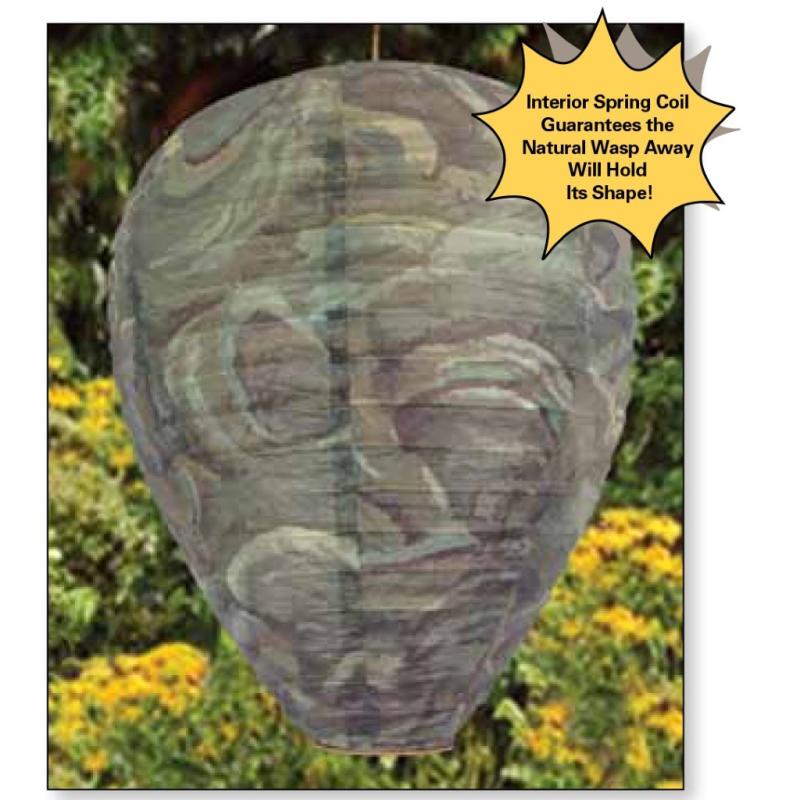 This product acts as a scarecrow for wasps. It is perceived as a hornet’s nest, so wasps see this as a predator and avoid the area. Keeps wasps away but does not kill them. Wasps are beneficial to our environment and help regulate pests such as aphids, caterpillars and mosquitoes. Other traps and bug zappers kill wasps which may cause more wasps to target the area. When a wasp dies, it releases a pheromone which attracts more wasps. If you have large existing nests, have them removed, then continue to use DeWitt Natural Wasp Away every year.