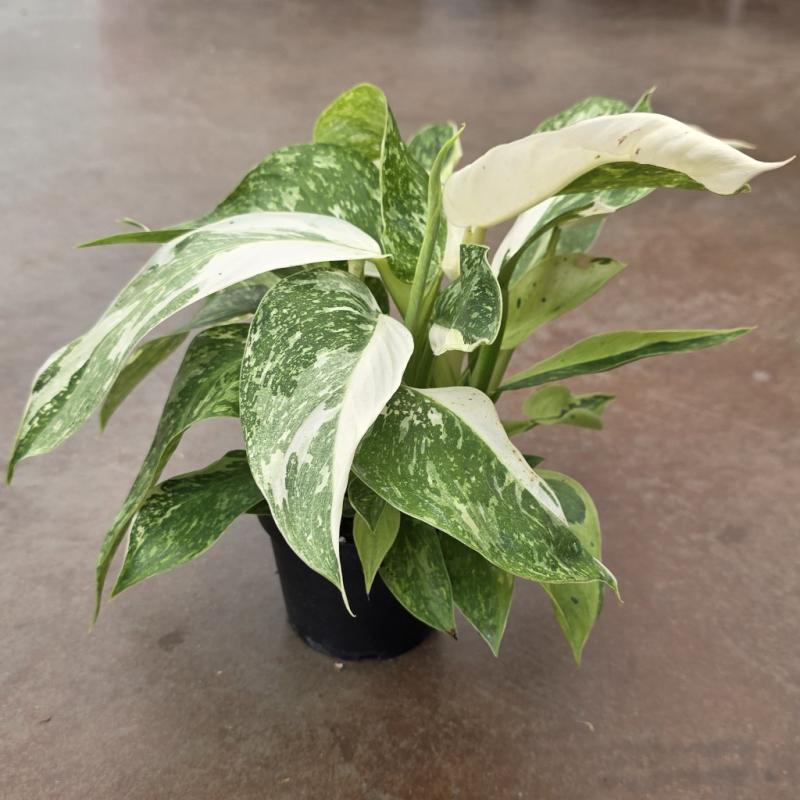 Philodendron ‘Jose Bueno Fiesta’ is an exceptional collector’s plant prized for its large, dramatic leaves splashed with stunning creamy-white to lime-green variegation. Each broad, glossy leaf is uniquely patterned, adding bold, tropical flair and instant visual interest to any space. This climbing philodendron loves bright, indirect light and high humidity to show off its best color, and it can be trained up a moss pole to develop even larger, showier leaves. Easy to care for with regular watering and well-draining soil, ‘Jose Bueno Fiesta’ is the perfect statement piece for the serious aroid lover.