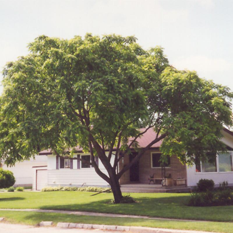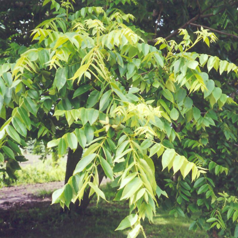 A medium sized shade tree with a wide spreading canopy and interestingly textured compound leaves; sweet oily walnuts are edible and attract squirrels, can be somewhat messy in fall; possibly the hardiest of all nut trees
