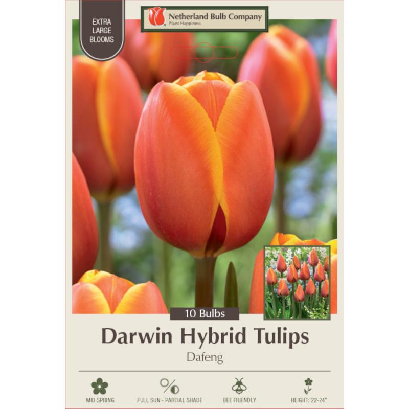 A Darwin Hybrid tulip featuring bold, orange-red blooms with feathered yellow margins. Known for its tall, sturdy stems and long-lasting flowers, 'Dafeng' is ideal for borders and cut flower arrangements.