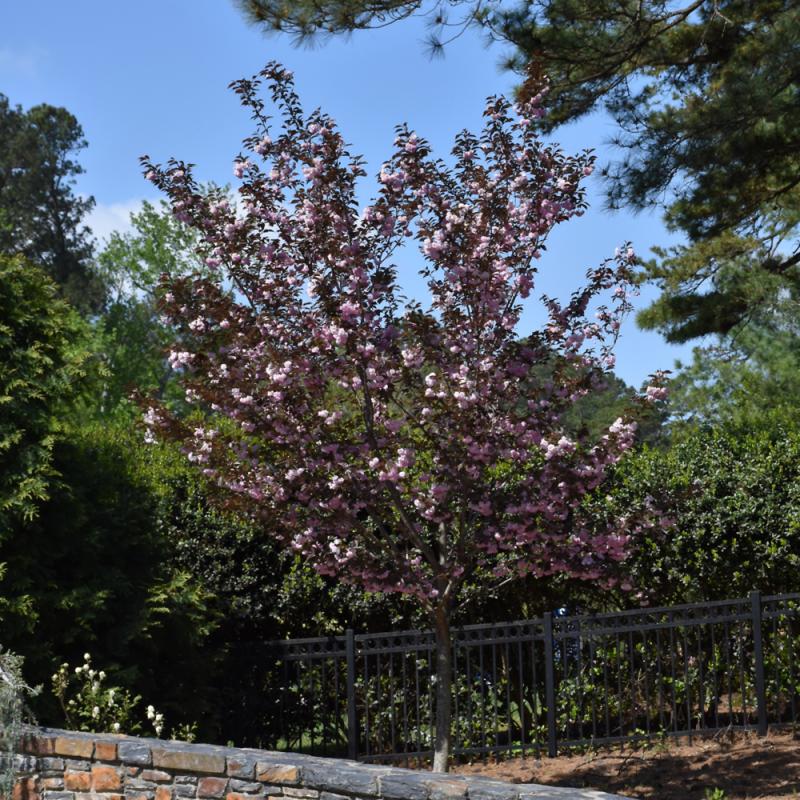 An exciting new variety of flowering cherry, with pretty double reddish-pink flowers emerging along with the burgundy leaves in early spring which fade to green in summer, bronze bark, good fall color, very shapely; needs full sun and well-drained soil