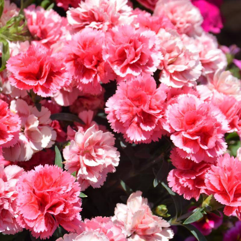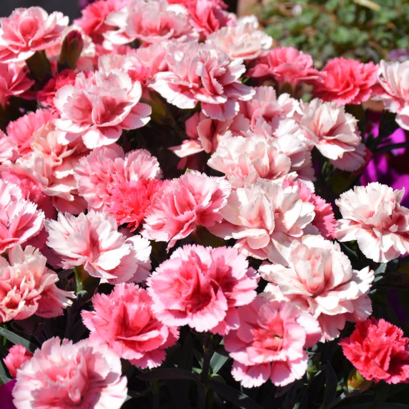 Double, silvery pink miniature carnations with scarlet streaks and lightly frilled edges bloom consistently over a long season, especially in warmer climates; great for border fronts, containers, and floral arrangements