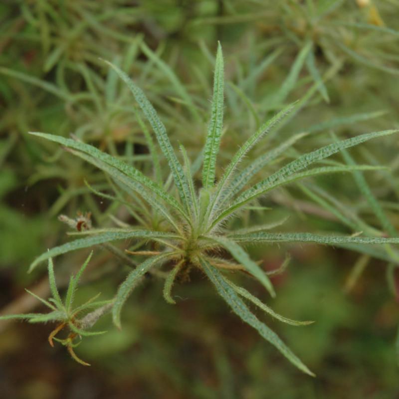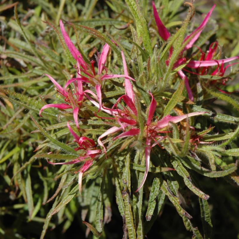 A rare find in cultivation; both the deep pink flower petals and the dark green leaves are distinctly linear; a truly exotic form of azalea; needs highly acidic and organic soil that is well drained