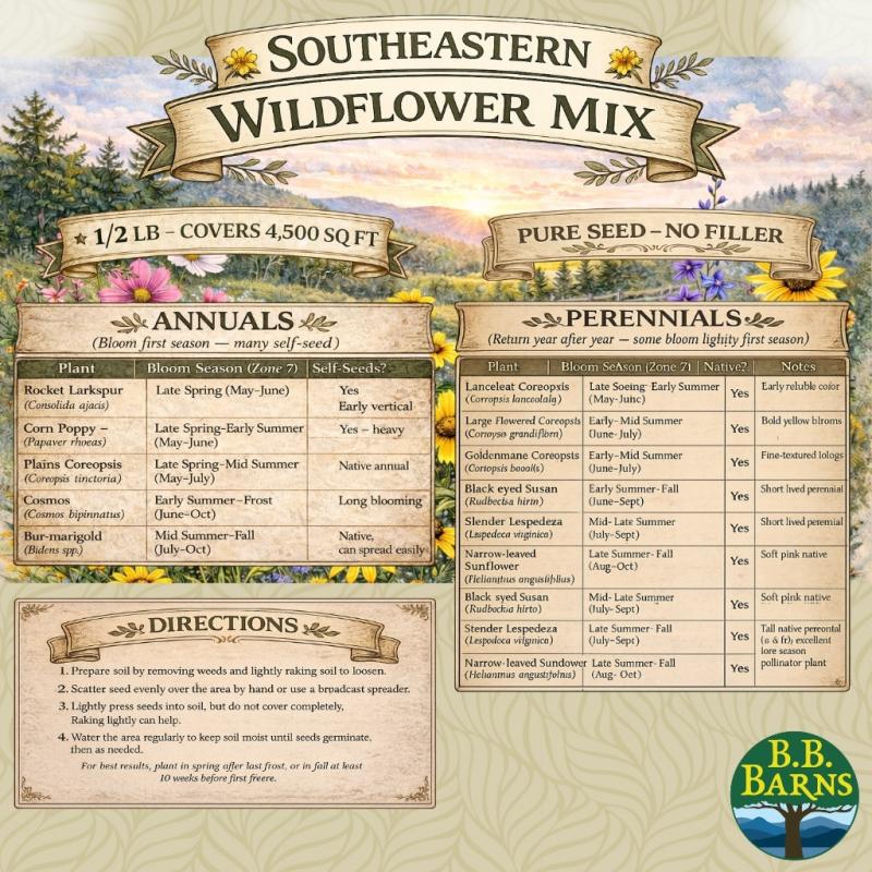 Our store-packed blend of southeastern wildflower seeds contains no fillers. A 1/2 lb bag covers approximately 4,500 sq. ft.