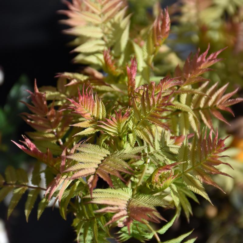 A nicely rounded shrub, presenting tropical-like, ferny foliage that emerges vivid pink to red, turns chartreuse with bronze tips, then matures to light green; showy white flowers are followed by bright red pods; an excellent low hedge or border accent