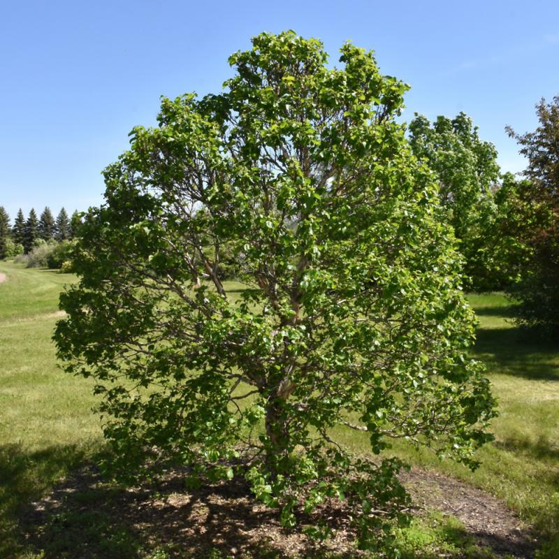 A distinctive dwarf birch that features captivating white peeling bark with cinnamon colored undersides; compact with a rounded form, and single trunked; a very attractive tree for smaller landscapes