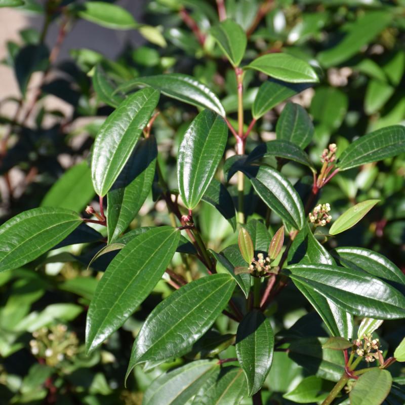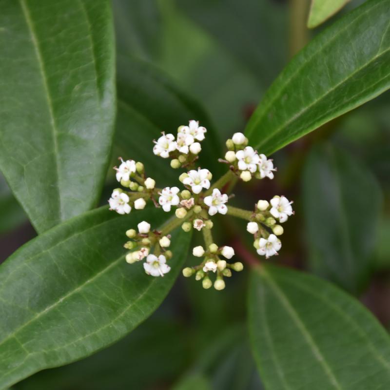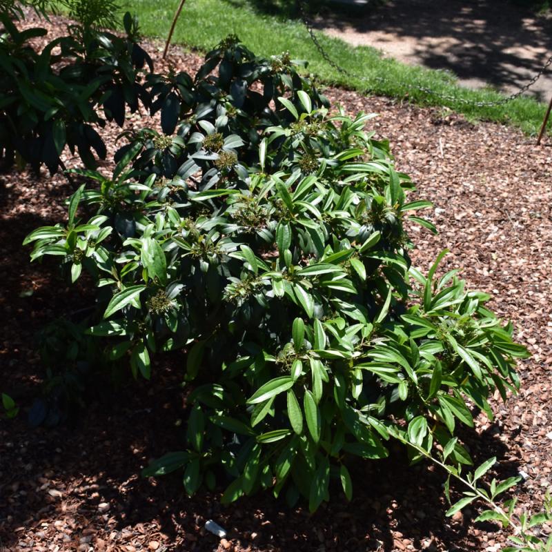 A mounded and compact broadleaf evergreen shrub featuring lacy clusters of white flowers, emerging from pink buds in early spring; foliage takes on burgundy coloring in fall; an ideal specimen, border shrub, or low hedge