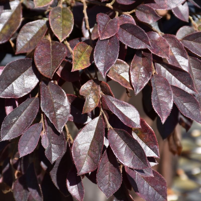 Eye-catching, scarlet fringed flowers are heaviest in spring on this compact mounded evergreen shrub, but repeat throughout the year; displays dark purple foliage year-round; needs regular watering, especially in midsummer heat