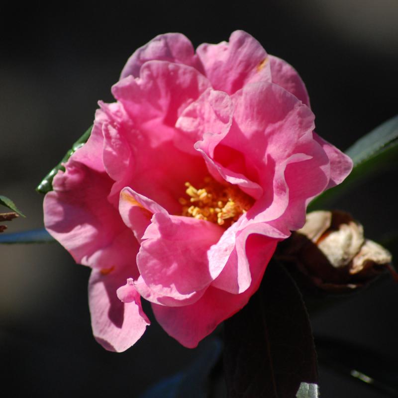 A compact, upright grower with glossy, evergreen leaves that look striking against masses of large, semi-double, ruffled pink flowers; provide rich, acidic, moist, well-drained soil