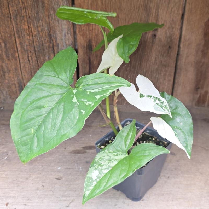 Syngonium ‘Albo’ is an eye-catching, highly sought-after variety known for its striking white variegation splashed across lush, arrowhead-shaped green leaves. Each leaf is uniquely patterned, offering a living work of art that evolves over time. Perfect for trailing from shelves or hanging baskets or climbing a moss pole for a dramatic vertical display. It thrives in bright, indirect light and appreciates evenly moist, well-drained soil. A must-have for collectors seeking a truly spectacular indoor plant.