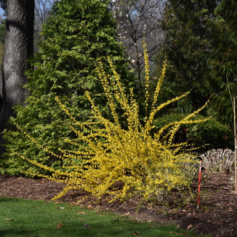 A compact shrub suited to borders or in the garden; superior, brilliant yellow bell-shaped flowers in spring along the branches and deep green foliage have made this a garden favorite for early spring color